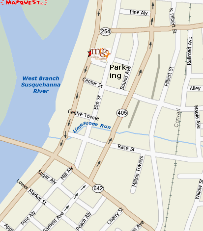Take Rt. 99 to Interstate 80E. Exit onto US Rt. 15S at exit 210A toward Lewisburg. Take the second exit(Rt. 642-Milton/W. Milton). Go east on Rt. 642. Cross the West Branch Susquehanna River and pass Milton State Park. After crossing the bridge, take the second left onto Arch St then the second left onto Center St. before the McDonald's. Turn right onto Bound Ave. Turn left into the public parking lot.